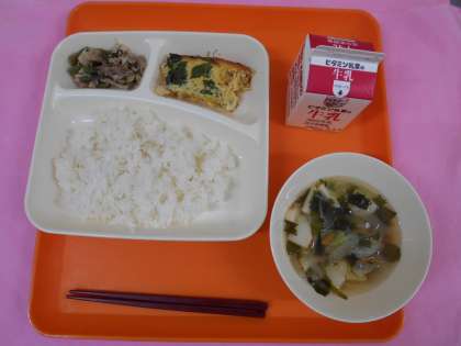 今日の給食は、ごはん、牛乳、具だくさん卵の千草焼き、五目汁、豚肉とさんどまめのいためものです。