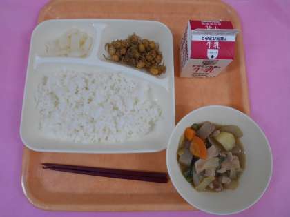 今日の給食は、ごはん、牛乳、鶏肉と野菜の煮もの、じゃこ豆、かぶのゆず風味です。