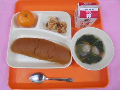 今日の給食は、黒糖パン、牛乳、さけのマリネ、肉だんごと麦のスープ、みかんです。