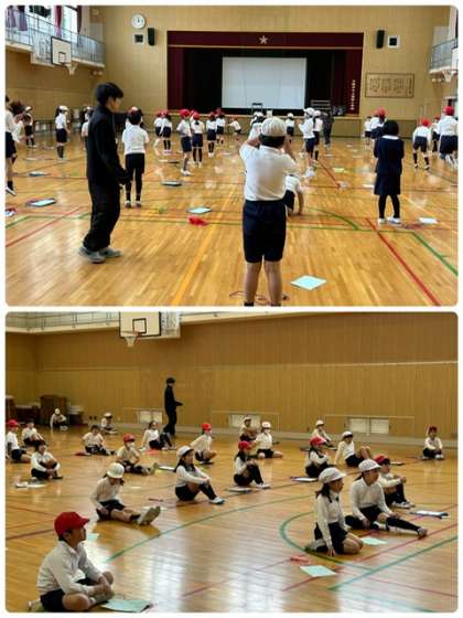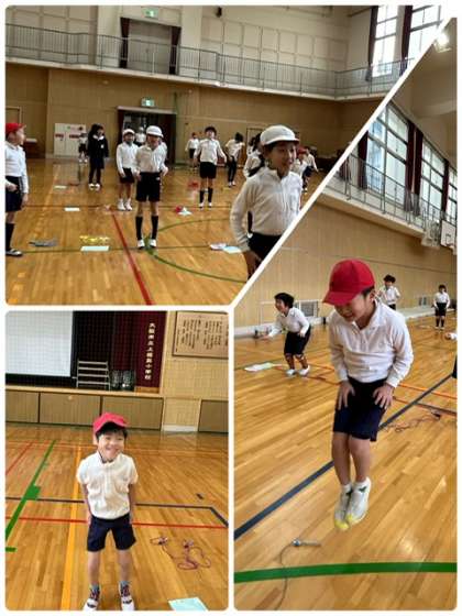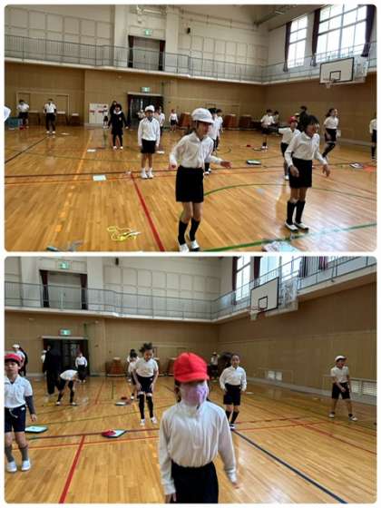 講堂で縄跳びをしています。縄をつかわない練習もしました。
