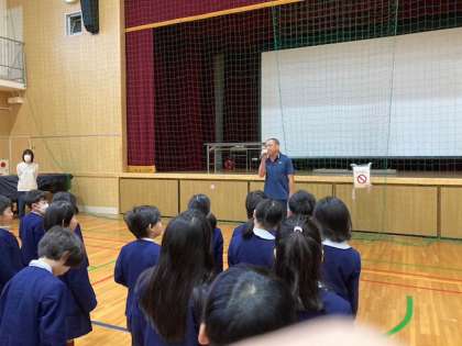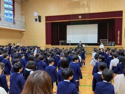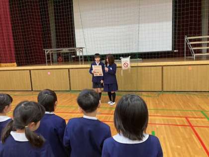 今日は、小雨がぱらついていたことから、講堂で児童朝会を行いました。