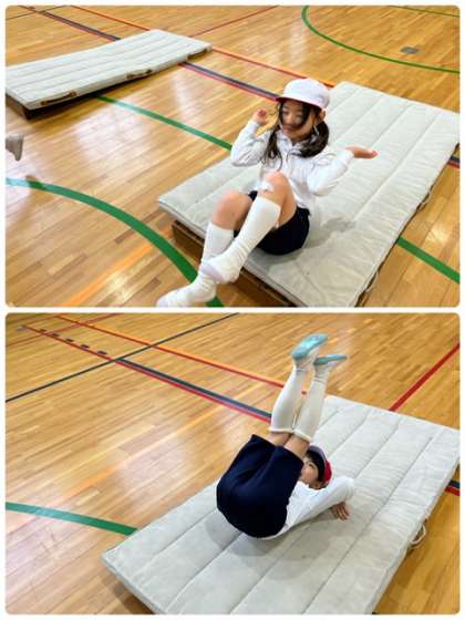 講堂でマット運動をしました。後転は、なかなか難しいようです。