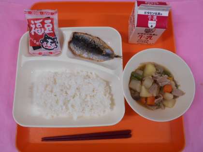 今日の給食は、ごはん、牛乳、いわしのしょうがじょうゆかけ、含め煮、いり大豆です。