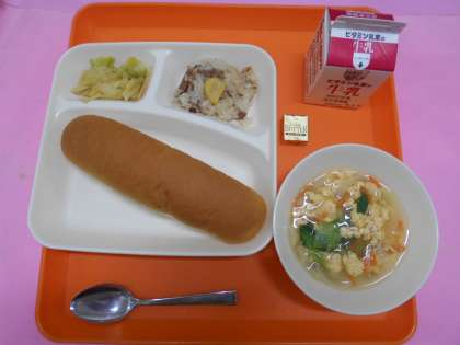 今日の給食は、コッペパン(バター)、牛乳、中華おこわ、卵スープ、キャベツのオイスターソースいためです。