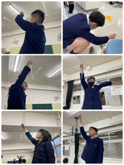 空気の温まり方の実験をしました。教室の上と下の温度を比べています。