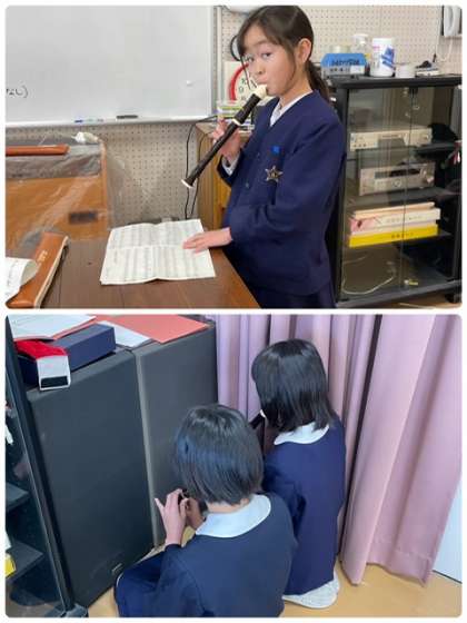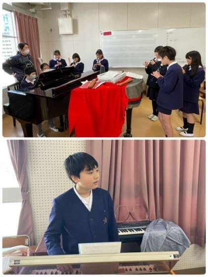 6年生が音楽の時間の合奏のために、休み時間に自主練習に来ていました。