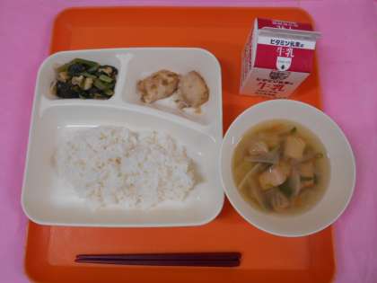 今日の給食は、ごはん、牛乳、鶏肉のなにわ甘辛ソースかけ、船場汁、こまつなの炊いたんです。