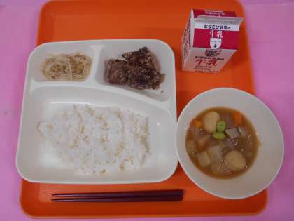 今日の給食は、ごはん、牛乳、くじらのたつたあげ、まる天と野菜の煮もの、もやしのしょうがづけです。