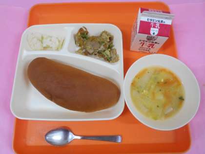 今日の給食は、黒糖パン、牛乳、豚肉のカレー風味焼き、コーンとはくさいのスープ、カリフラワーのレモンドレッシングです。