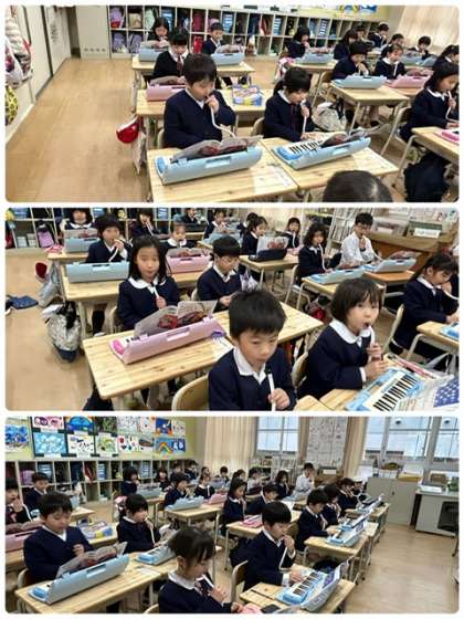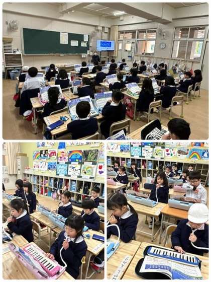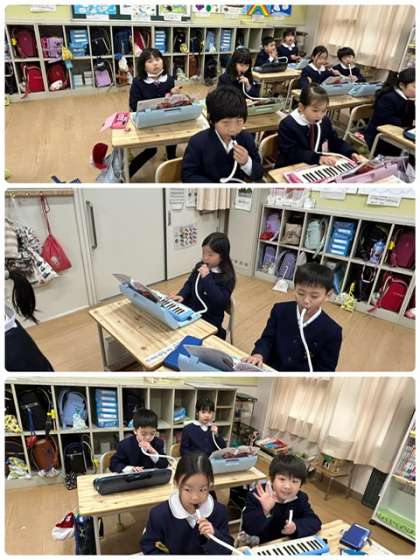 みんなで鍵盤ハーモニカを吹いています。なかなか指使いが難しいようです。