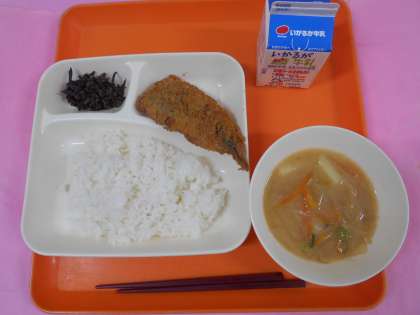 今日の給食は、ごはん、牛乳、いわしフライ、みそ汁、牛ひじきそぼろです。