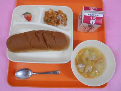 今日の給食は、黒糖パン、牛乳、とうふのミートグラタン、じゃがいもと野菜のスープ、いちごです。