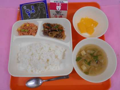 今日の給食は、卒業祝い献立で「手巻きごはん(牛肉のコチジャンいため、さけのカラフルそぼろ)、牛乳、すまし汁、ダイスゼリー(みかん)」です。