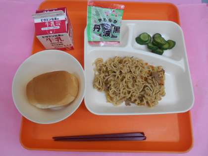 今日の給食は、ミニコッペパン、牛乳、焼きそば、きゅうりのしょうがづけ、ソフト黒豆です。