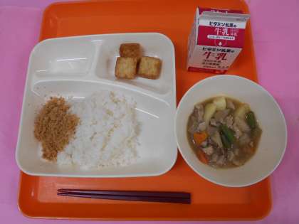 今日の給食は、ごはん、牛乳、鶏肉とじゃがいもの煮もの、あつあげのしょうゆだれかけ、紅ざけそぼろです。
