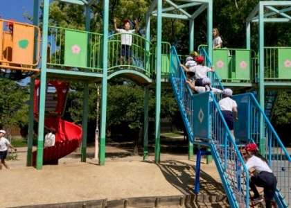 写真は大阪城に着き、公園で遊んでいる様子です。