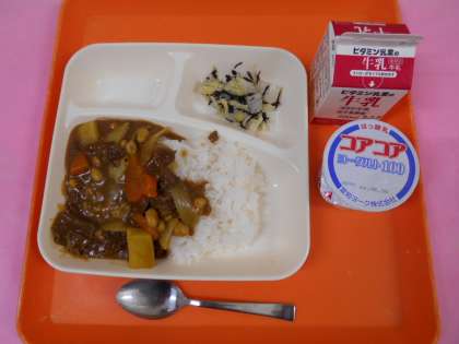 今日の給食は、牛肉と大豆のカレーライス、牛乳、キャベツのひじきドレッシング、ヨーグルトです。