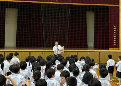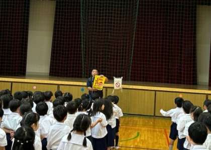 本日の児童朝会では、福島区の青パトロールの方の紹介がありました。児童のみなさんの安心・安全を守るために活動をしてくれています。