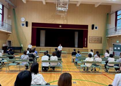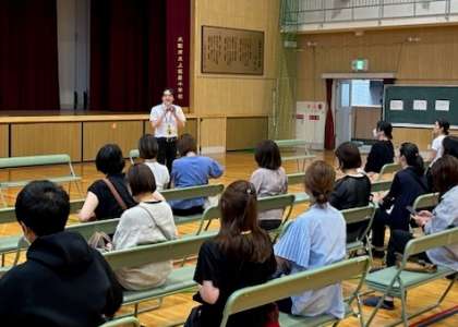 写真は親子清掃の前に講堂にて校長先生と早野先生から親子清掃の目的と掃除場所などの説明を受けているときの様子です。