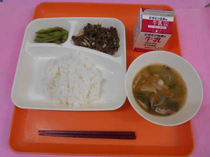 今日の献立は、ごはん、牛乳、チンジャオニューロウスー、中華みそスープ、枝豆です。