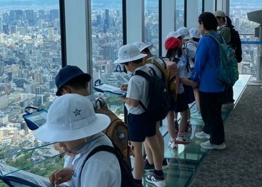6月3日(月)3年生は社会見学にあべのハルカスに行きました。「大阪市」の学習の中で、高い建物から、大阪市の様子を眺め、大阪市を4方位で比較しながら見学しました。子どもたちは「西側には海があるんだ」、「北側は高い建物が多いな」という気づきの声が聞こえました。見学したことをもとにして大阪市の様子についてまとめてください。