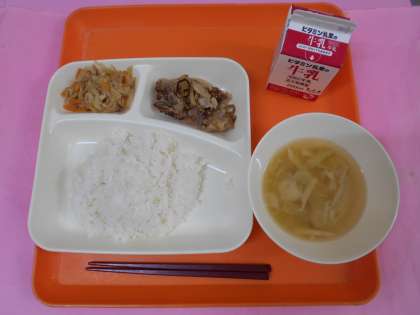 今日の給食は、ごはん、牛乳、豚肉のごまみそ焼き、すまし汁、切干しだいこんのいため煮です。