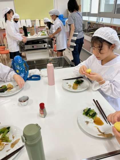 5年1組の調理実習の様子です。子どもたちはどの子もおいしくいただくことができました。