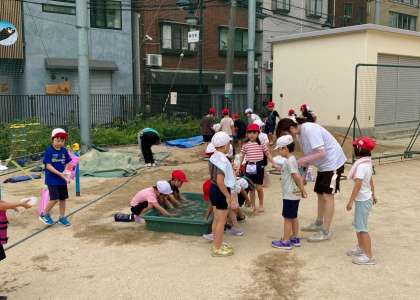 本日1年生はどろんこ遊びを行いました。連日の猛暑で延期になっておりましたが、今日は曇りで暑すぎず、活動がしやすかったです。