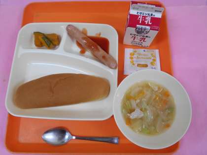 今日の給食は、コッペパン(マーマレード)、牛乳、ウインナーのケチャップソース、スープ、焼きかぼちゃです。