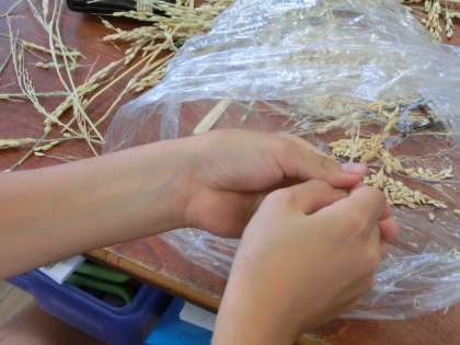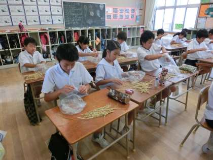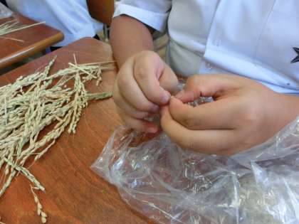 はじめは、「えーできない」となかなか進まなかった作業でしたが、「こつがわかったよ」という声があがり、一気に作業が進みだしました。さらに、脱穀したもみを一粒ずつむいていく作業(もみすり)も体験しました。