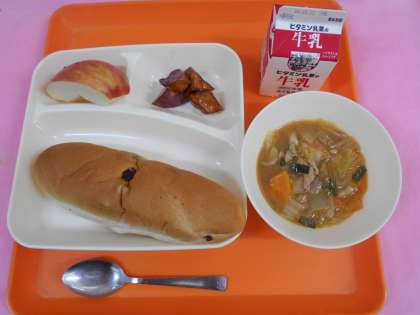 今日の給食は、レーズンパン、牛乳、中華煮、大学いも、りんごです。