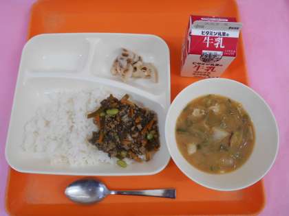 今日の給食は、もずくと豚ひき肉のジューシー、牛乳、さつまいものみそ汁、焼きれんこんです。