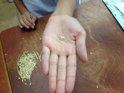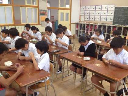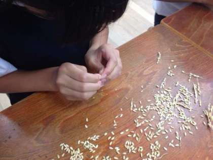 今日は、全く機械を使わず手作業でもみすりをしました。たくさんのもみ米を前にして、気の遠くなる作業でしたが、集中して体験することができていました。