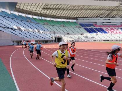子どもたちは、大阪市立中央小学校、大阪市立海老江東小学校の子どもたちとともに、100mを走ります。
