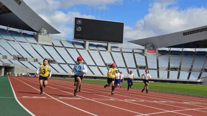 本格的な陸上競技場で100mを走るのは、はじめての子もいると思いますが、自分を信じて思い切り走ってください。