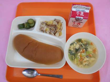 今日の給食は、黒糖パン、牛乳、中華おこわ、卵スープ、きゅうりのピリ辛あえです。