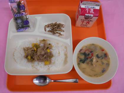 今日の給食は、れんこんのちらしずし、牛乳、ぞう煮、ごまめです。