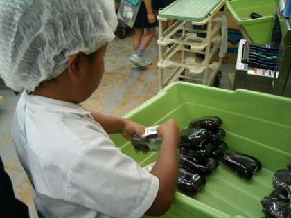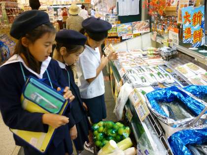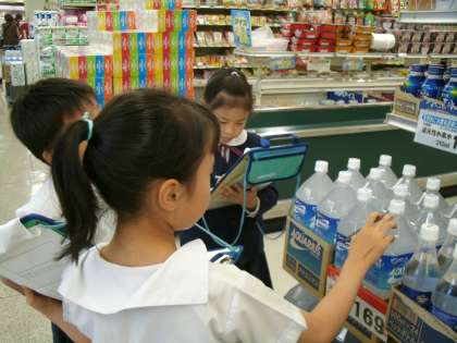 各グループで、メモを取りながら商品の陳列の仕方や種類など、お店の工夫しているところをしっかり調べることができました。実際に、ラベルを貼る作業も体験させてもらいました。