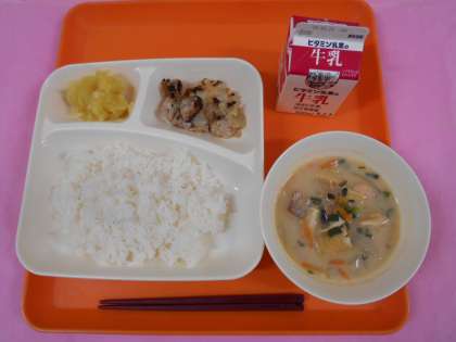 今日の給食は、ごはん、牛乳、鶏肉の塩こうじ焼き、かす汁、くりきんとんです。