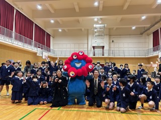 その後、臨時大使との写真撮影の際、この交流が今年の関西万博にも引き継がれることを願って、ミャクミャクが登場してくれました。子どもたちは大喜びでした。