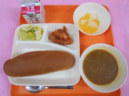 今日の給食は、黒糖パン、牛乳、あげどりのバーベキューソースがけ、カレースープ、キャベツとコーンのサラダ、フルーツゼリーです。