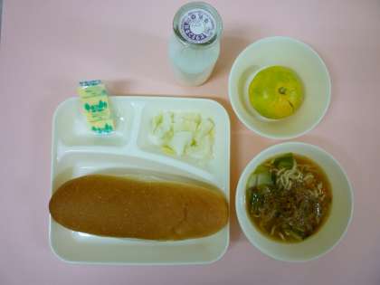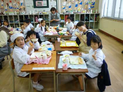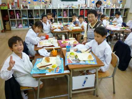 1年生は、毎日残さず給食を食べています。給食の準備や後片付けもとても上手です。担任の先生が、「毎日食育通信」を使って、食べ物クイズをしたり、食べ物についての一口メモを説明したりします。子どもたちは、毎日、食べることの大切さを学んでいます。