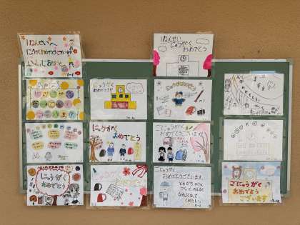 それぞれの学級で絵やことばで入学のお祝いを表現しています。