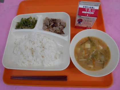 今日の給食は、ごはん、牛乳、豚肉のしょうが焼き、とうふのみそ汁、じゃこピーマンです。