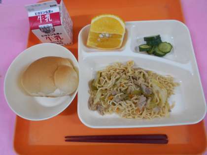 今日の給食は、ミニコッペパン、牛乳、焼きそば、きゅうりのしょうがづけ、あまなつかんです。