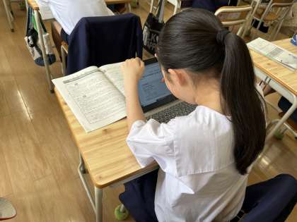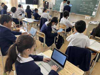 学習者用端末を活かして、海や森林等の環境問題について調べ、どうすれば持続可能な開発ができるかを考えていました。