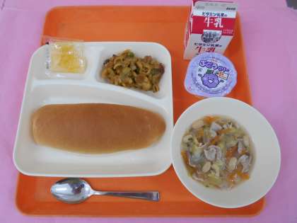 今日の給食は、コッペパン(マーマレード)、牛乳、カレーマカロニグラタン、てぼ豆のスープ、ぶどうゼリーです。