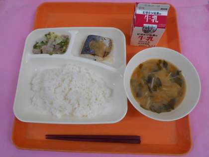 今日の給食は、ごはん、牛乳、さごしのおろしじょうゆかけ、みそ汁、野菜いためです。