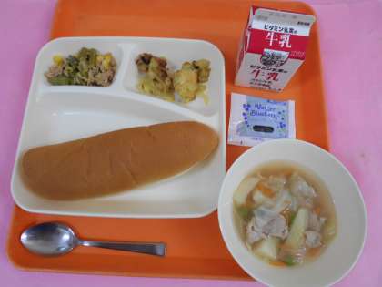 今日の給食は、コッペパン(ブルーベリージャム)、牛乳、鶏肉のカレー風味焼き、スープ、ツナとさんどまめのソテーです。