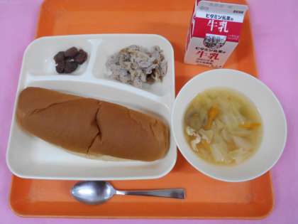 今日の給食は、黒糖パン、牛乳、豚肉のバジル焼き、鶏肉とキャベツのスープ、うずら豆のグラッセです。
